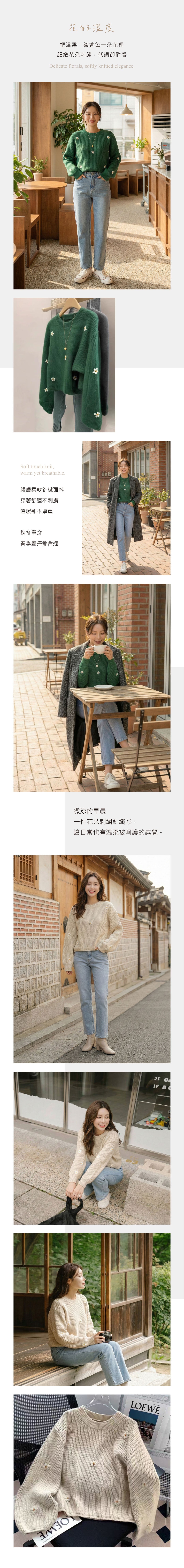 日系慵懶風 (疊搭層次感): 內裡疊穿一件圓弧下擺的白色長版襯衫,露出下擺與領口,搭配淺色牛仔褲。這種穿法能完美平衡「立體刺繡」的甜美感,增加率性氛圍。
